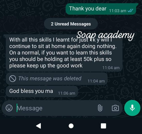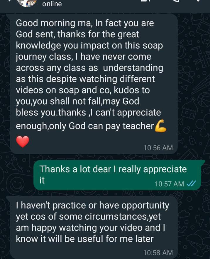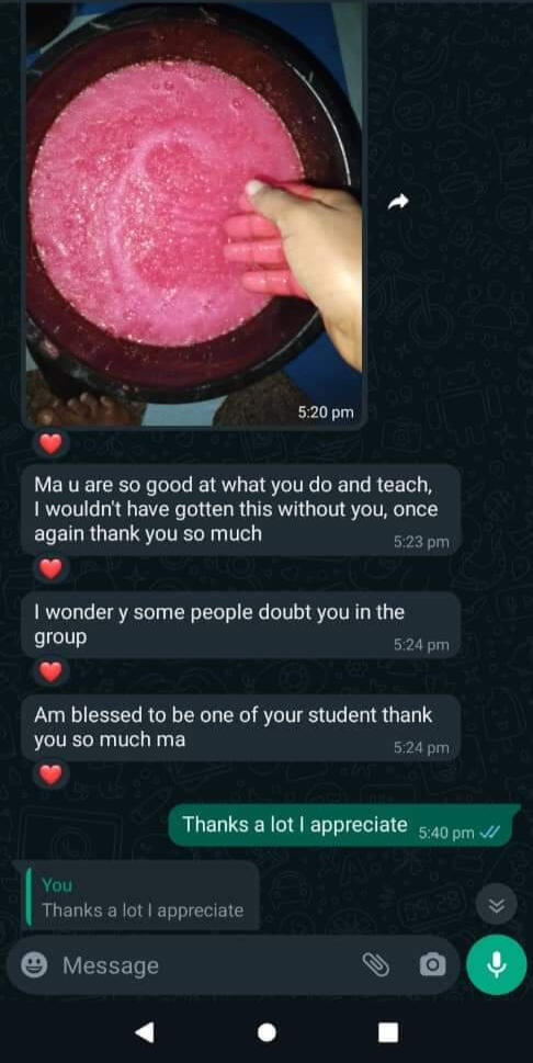 My name is Cynthia Ekwueme and the face behind this training 😊😊I am a Microbiologist, a product of the prestigious Federal Polytechnic Nekede, Imo state,I have worked with reputable medical firms in Port Harcourt, Rivers state and School of Nursing Uyo, Akwa Ibom before going on to set up a training platform known as Learn a Skill Today initiative.Here we have trained over 3,000 persons in various skills such as Bag and footwear production, Fashion designing, Soap making etc.